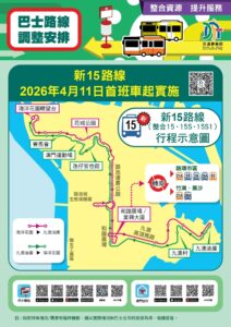 交通事務局訊:為優化公共資源配置,交通事務局持續透過數據分析客流,並與兩間巴士公司協調,推動路線重組與站點優化。4月11日起將實施新15路線的巴士服務,並調整5...