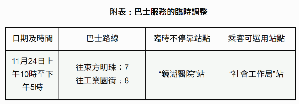市政署/交通事務局訊:因應市政署開展樹枝修剪工作,鏡湖馬路近俾利喇街路段(靠近左側車行道一側)於11月24日上午10時至中午12時30分、下午3時至5時實施有限度通車。配合工作,“鏡湖醫院”巴士站於同日上午10時至下午5時臨時停用,乘搭7(往東方明珠)、8(往工業園街)路線的乘客,屆時可使用“社會工作局”站上落,詳情可查閱附表及澳巴網頁(澳巴)。 發佈日期︰ 2025-11-20 消息來源︰ 澳門日報