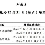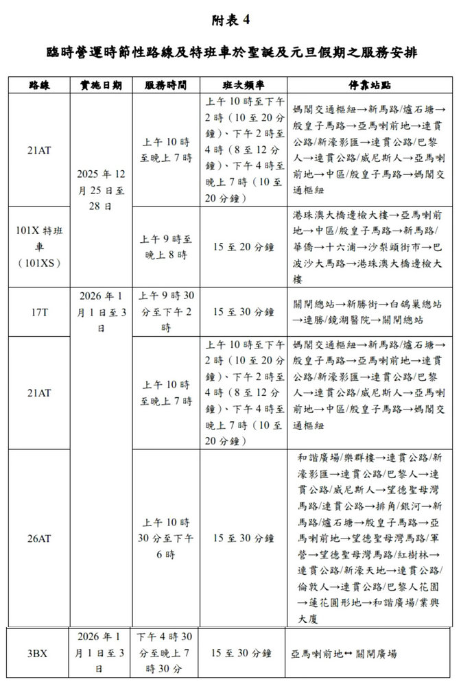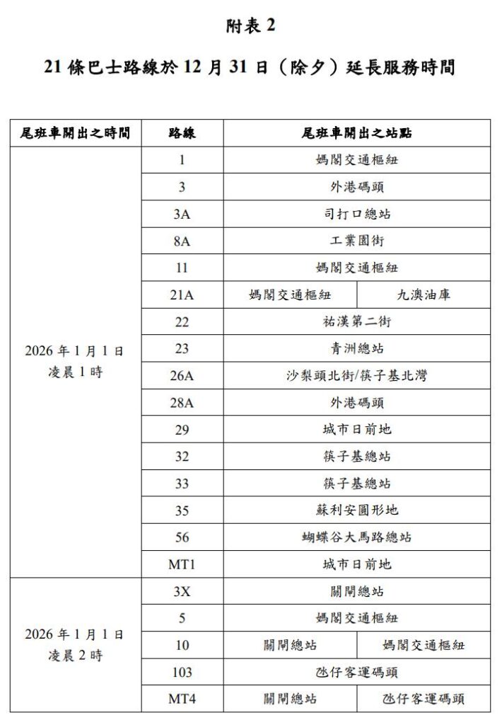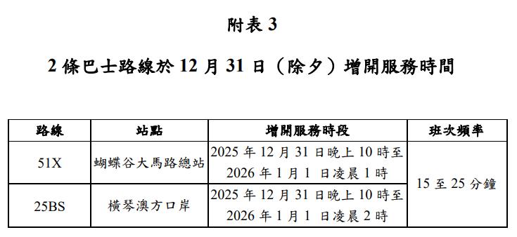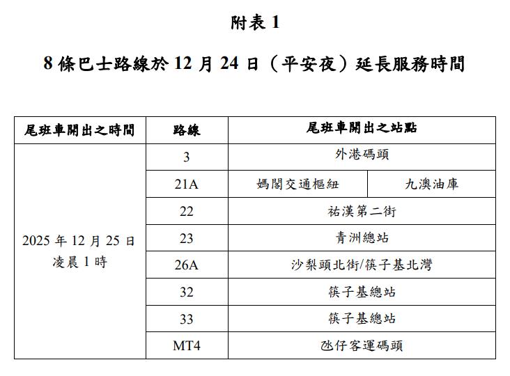 交通事務局訊:為回應市民於平安夜(24日)及除夕夜(31日)的出行需求,經交通事務局協調,屆時兩巴將分別延長部分日間路線的尾班車開出時間至凌晨1時或2時,並於2025年12月25日至28日、2025年12月31日至2026年1月3日期間,增開部分路線的特別班次,以疏導客流。詳情可查閱附表,以及澳巴、新福利網頁。 發佈日期︰ 2025-12-19 消息來源︰ 澳門日報