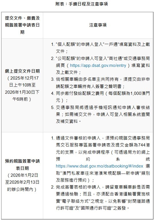 當中,因應香港運輸署於2026年1月1日起調整“封閉道路通行許可證”的有效期及收費,故是次兩輪配額的相關許可證亦按調整後的方式計算。上述調整亦適用於2026年起辦理香港牌證的續期、更換車輛或車輛註冊號碼的申請,詳情可瀏覽相關行政手續指南。