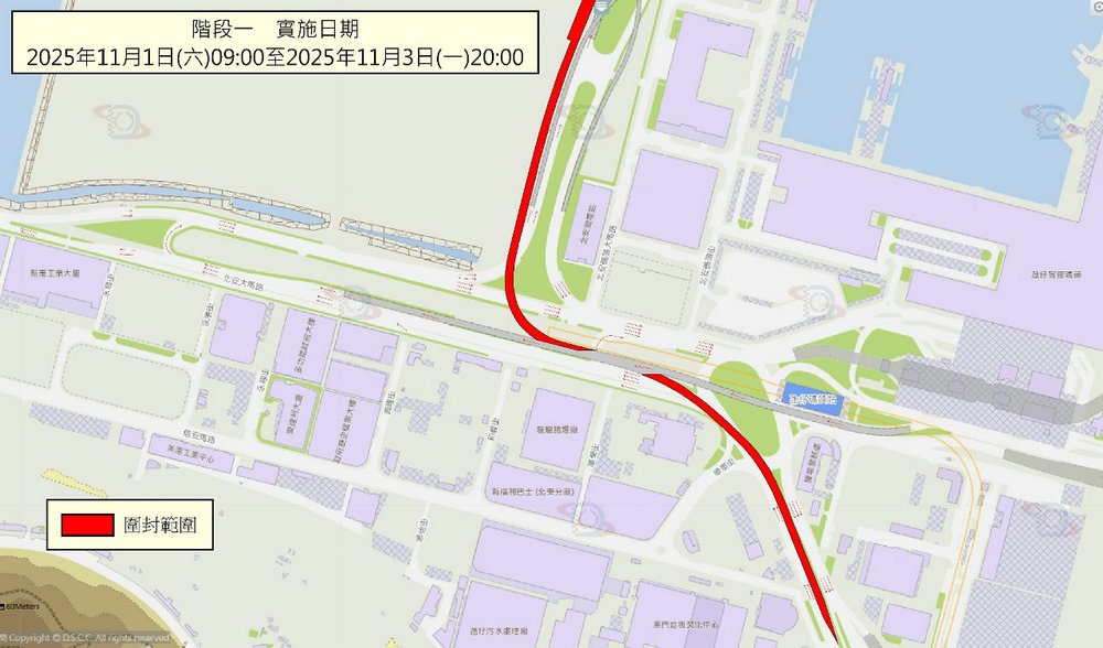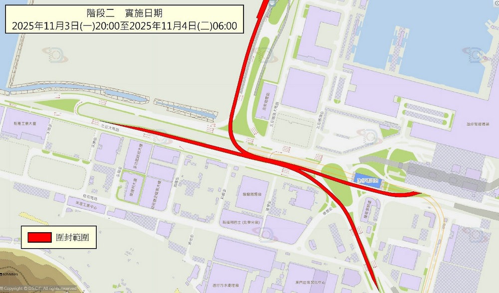 階段二:11月3日晚上8時至4日清晨6時,屆時氹仔偉龍馬路及氹仔碼頭往北安大馬路方向及澳門大橋的引橋將臨時封閉;車輛須經北安大馬路調頭前往澳門大橋。