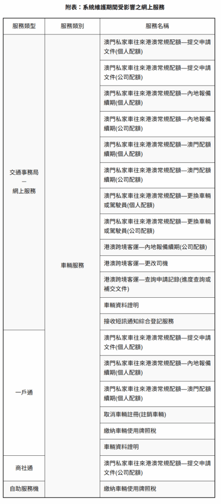 配合法務局系統維護工作,本月18日(周六)下午1時至19日(周日)早上10時,交通事務局部分網上服務將短暫停用,詳情可查閱附表。屆時相關服務的頁面會顯示提醒字句供市民知悉。 發佈日期︰ 2025-10-17 消息來源︰ 澳門日報