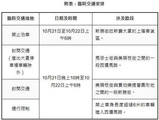 為配合市政署維修路面,10月21日(周二)至10月22日(周三)清晨6時期間,西墳馬路及新勝街實施臨時交通措施;其中,西墳馬路及新勝街的部分路段由10月21日(周二)晚上10時起至10月22日(周三)清晨6時實施封閉交通,詳情可查閱附表。