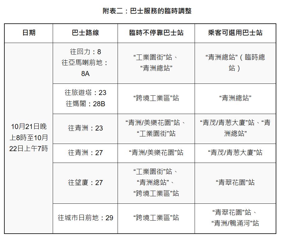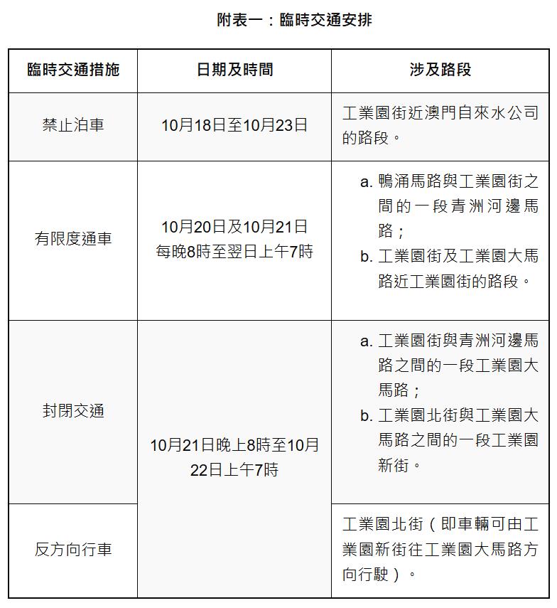 配合市政署重鋪路面,於10月18日(周六)至10月23日(周四)期間,工業園大馬路、工業園街、青洲河邊馬路、工業園新街及工業園北街實施臨時交通措施,詳情可查閱附表一。 巴士服務方面,多條相關路線於10月21日(周二)晚上8時起至翌日上午7時臨時不停靠部分站點,具體安排可查閱附表二及澳巴網頁。 發佈日期︰ 2025-10-17 消息來源︰ 澳門日報