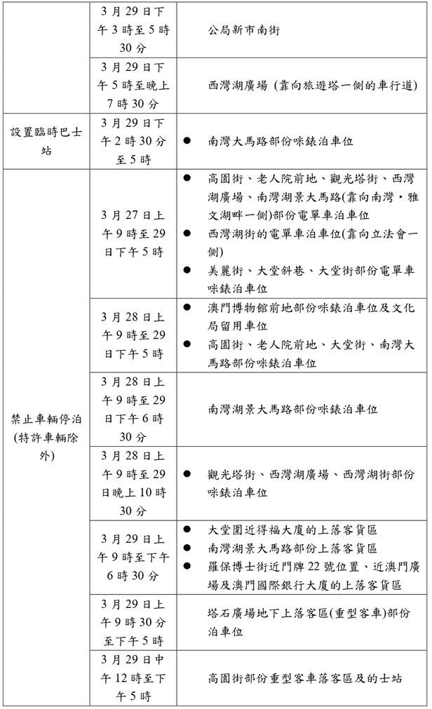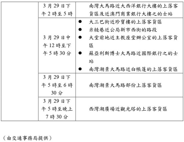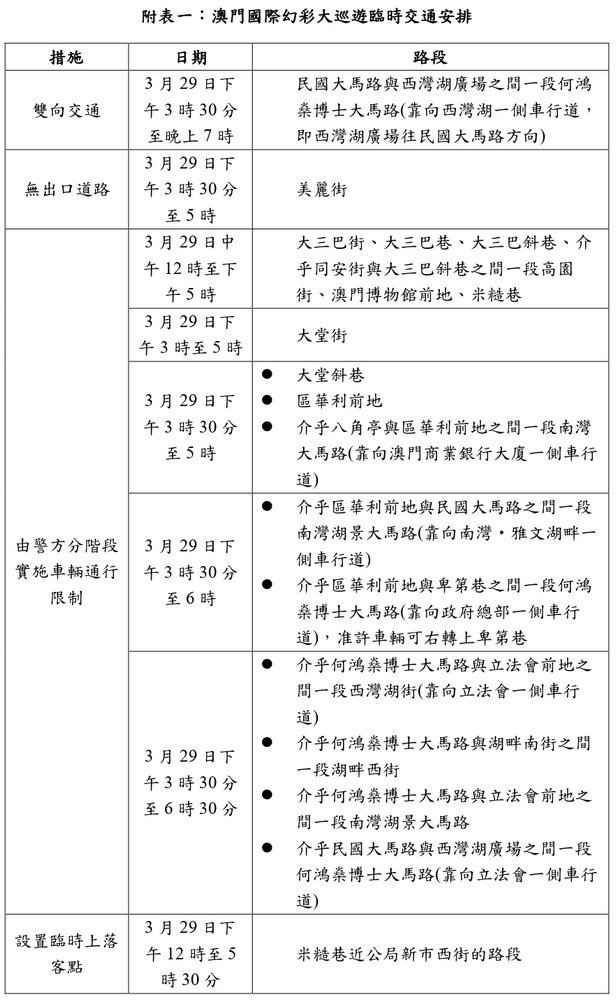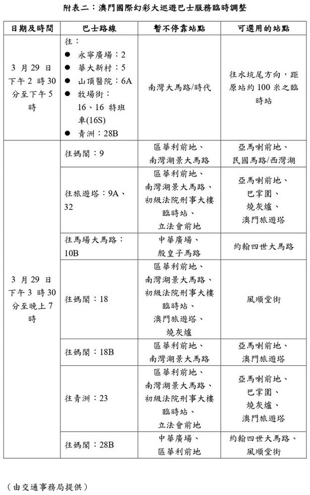 交通局訊:配合文化局3月29日(周日)舉行2026澳門國際幻彩大巡遊,3月27日(周五)至29日(周日)大三巴、大堂斜巷、南灣大馬路至西灣湖廣場多處道路實施臨時交通安排,行經有關路段的多條巴士路線於3月29日(周日)下午2時30分至晚上7時改道行駛,並臨時調整停靠站點。 有關臨時交通安排、巴士服務調整安排,以及活動相關資料,可查閱附件及澳門國際幻彩大巡遊、澳巴、新福利網頁。 發佈日期︰ 2026-03-26 消息來源︰ 澳門日報