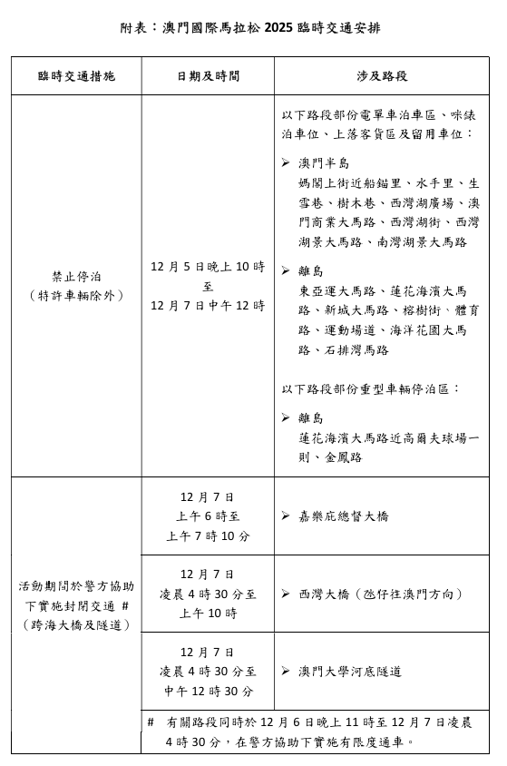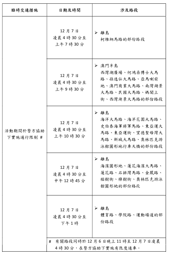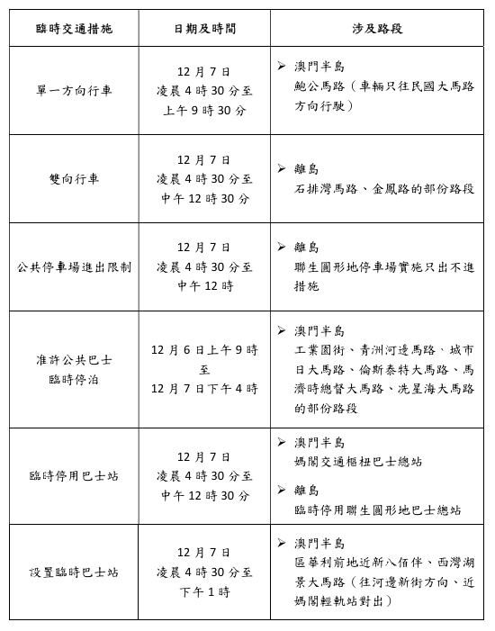 當中,配合澳門國際馬拉松比賽,路氹多處道路至西灣湖、科學館一帶賽道範圍及周邊道路,於12月5日至7日實施臨時交通管制措施。當中,嘉樂庇總督大橋、西灣大橋及澳門大學河底隧道7日凌晨至上午部分時段實施封閉交通,而聯生圓形地停車場7日凌晨4時30分至中午12時實施只出不進措施,當日多條公共巴士路線需臨時改道及調整停靠站點。有關活動臨時交通安排,詳情可參閱附件及兩巴網站(澳巴及新福利)。